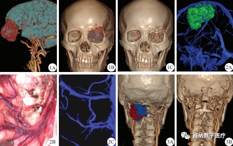 1B、1C:术前及术后的颅骨/脑肿瘤/脑血管的影像融合三维重建效果;